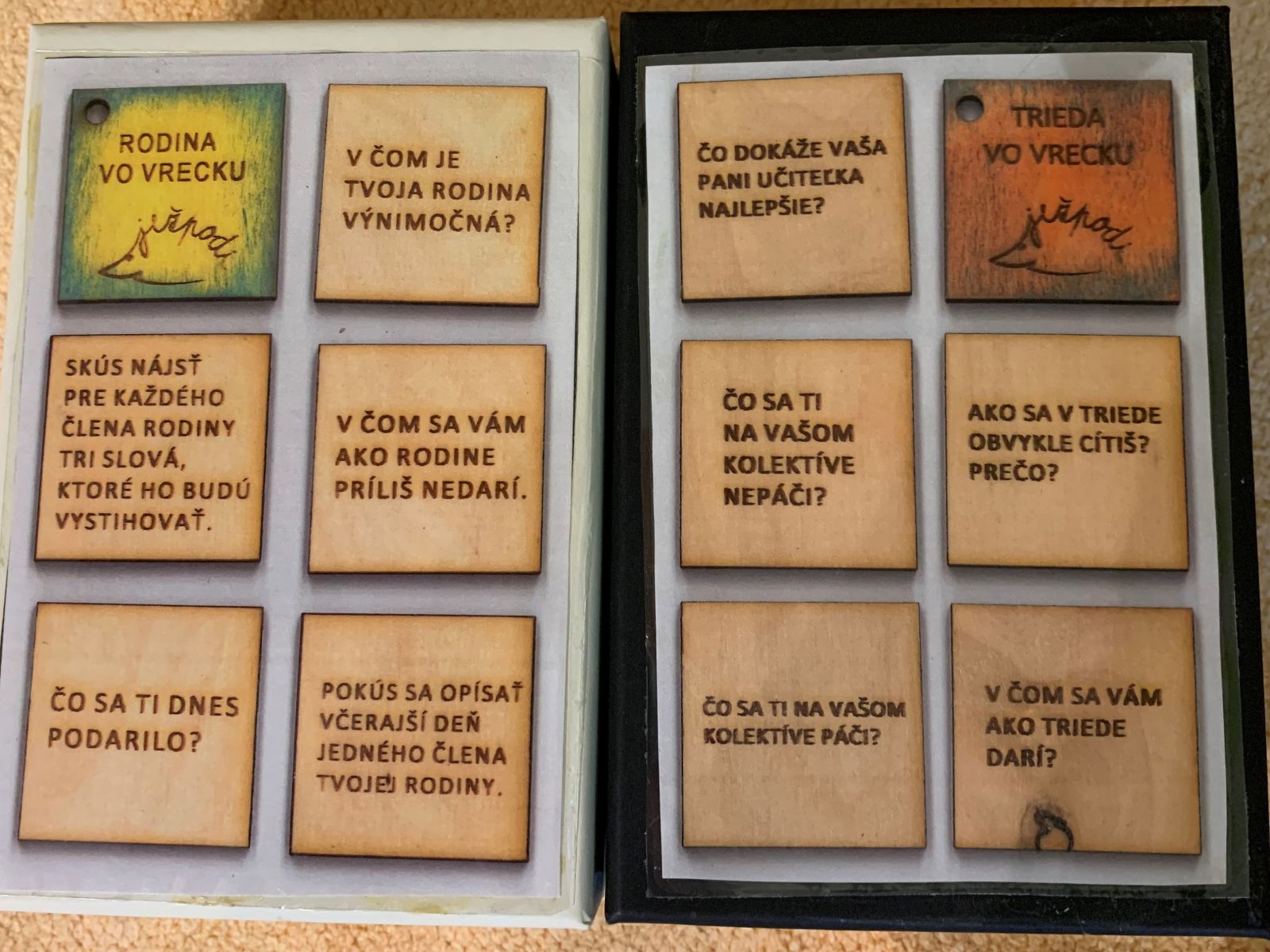 Obe vrecká obsahuje 28 otázok na drevených doštičkách (4x4cm) a sú kladené tak, aby sa na otázky dalo každý deň odpovedať inak.